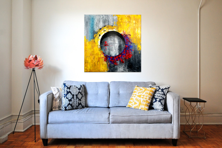 AURA est une œuvre abstraite puissante, construite autour d’un cercle central profond, symbole d’énergie et d’équilibre. Les contrastes de jaune lumineux, de gris minéral et de touches rouges et bleues créent une vibration intense, à la fois structurée et instinctive.