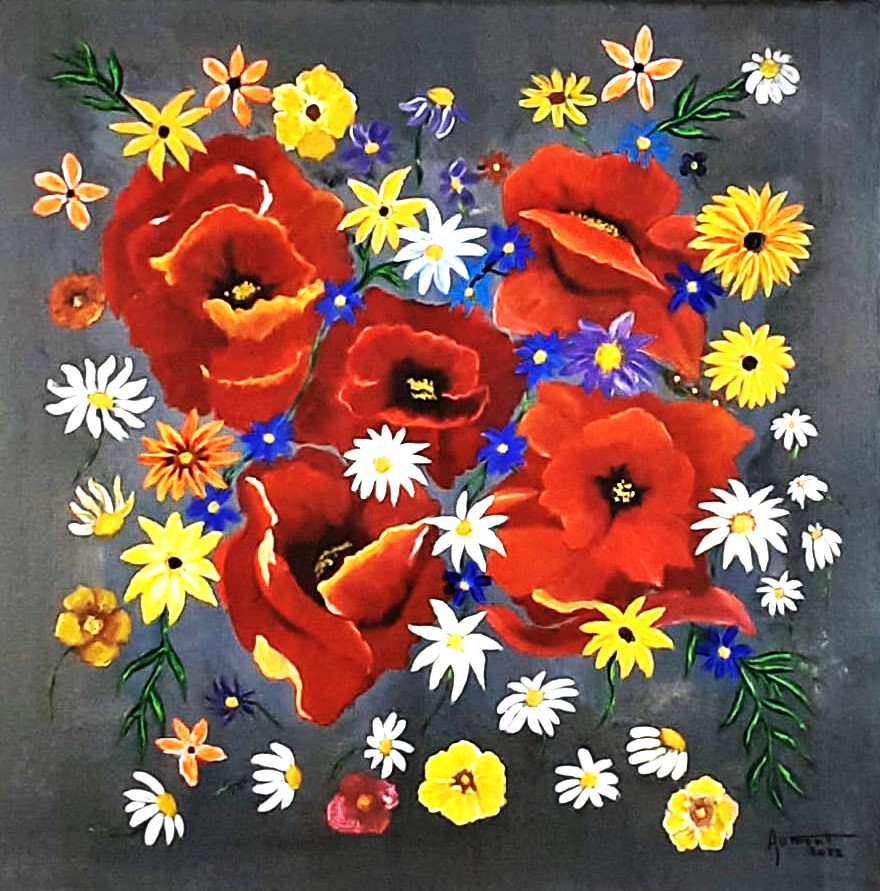 Bouquet champêtre éclatant où coquelicots rouges et fleurs sauvages dansent sur fond gris, apportant fraîcheur et vitalité.