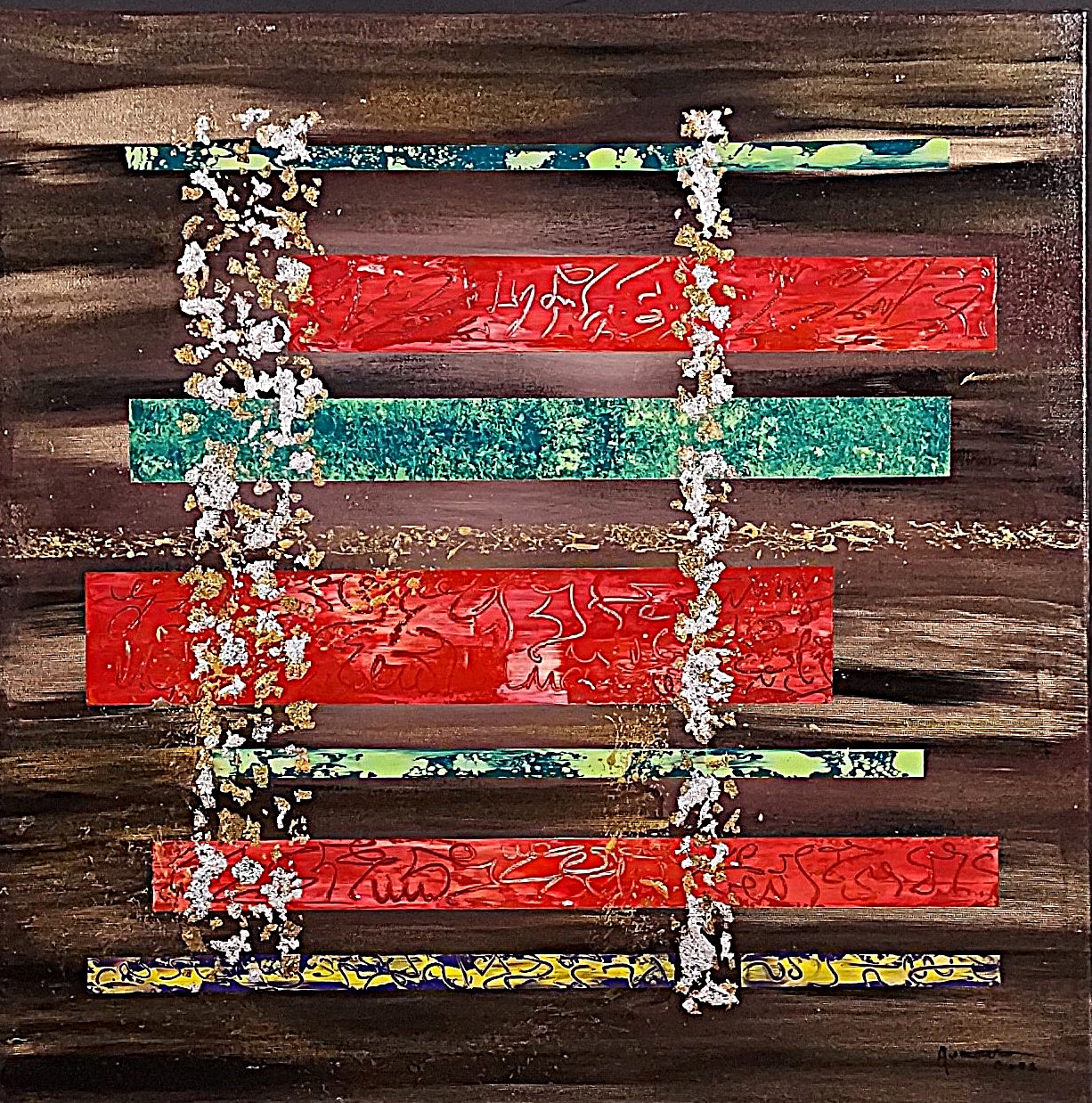 Peinture abstraite contemporaine à l’acrylique sur toile, construite autour de bandes horizontales colorées et d’une matière richement travaillée.
